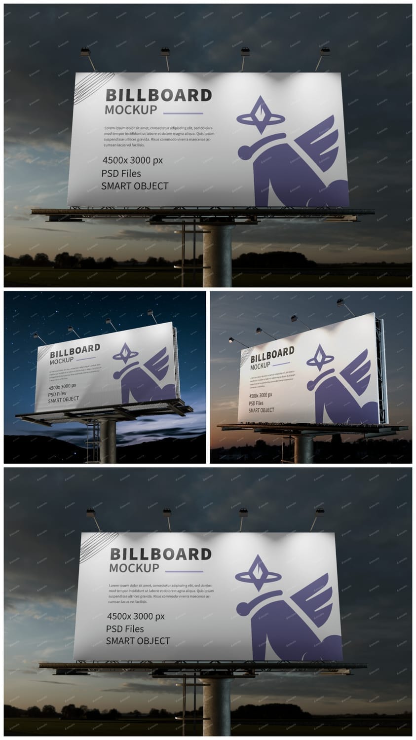 This Night and Twilight Billboard Mockup Template is a set of four high-quality PSD files designed to professionally showcase your advertising in a dramatic outdoor setting. The mockups feature a large, illuminated roadside billboard against backgrounds of a starry night sky or a soft twilight/sunset, offering different atmospheric options for your design.