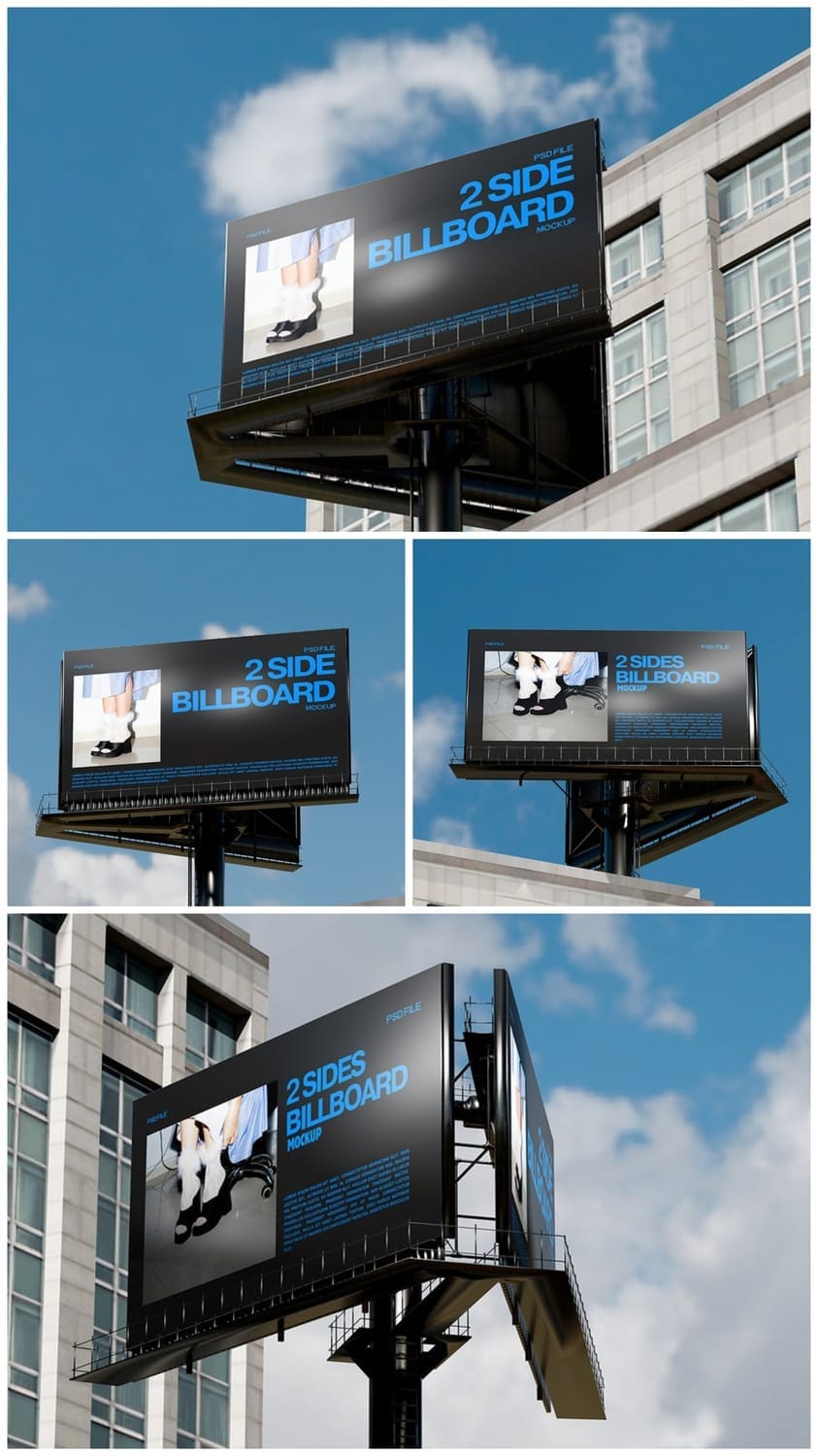 This 2 Sides Billboard Mockup is a highly versatile template designed for presenting advertising campaigns that require exposure from multiple directions. The product includes 4 high-resolution PSD files (4500x3000px at 300 DPI) that feature a dual-sided urban billboard set against a bright, cloudy sky and city buildings. It's built for easy and fast editing via Smart Objects and is engineered to make both bright and dark designs look great. With organized layers, customizable background colors, and adjustable lighting effects, this mockup is an excellent choice for showing a comprehensive, realistic outdoor display.