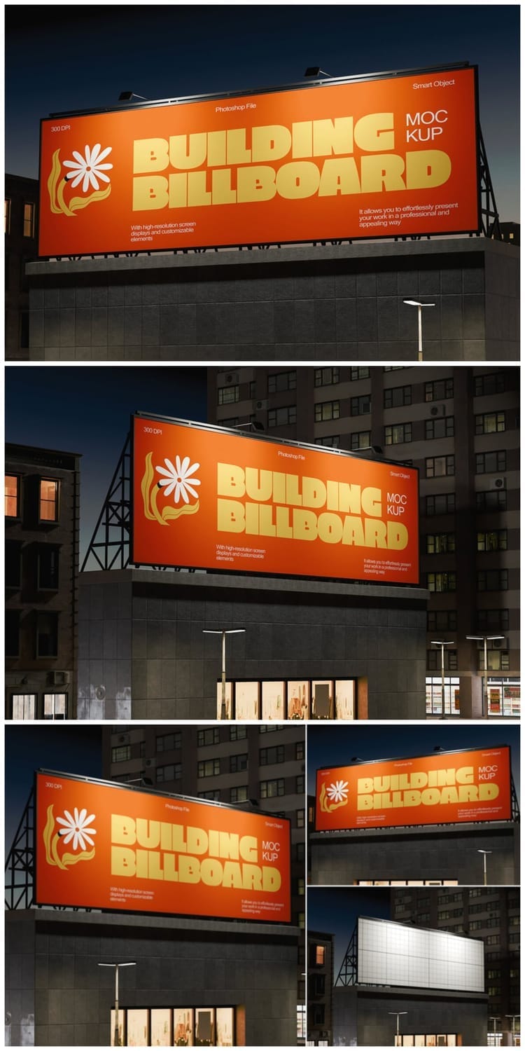 This Building Billboard Night Mockup offers a premium, high-resolution solution for showcasing large-format advertising in a realistic urban environment after dark. The set includes two Photoshop PSD files with an impressive resolution of 4500 x 3200 px at 300 DPI. Your designs can be effortlessly presented via Smart Object Layers on a billboard mounted atop a modern city building, complete with street-level lighting and surrounding architecture. With its organized layers and fully customizable elements (including designs, colors, and backgrounds), this mockup makes it easy to create a professional and appealing night-time advertisement preview.