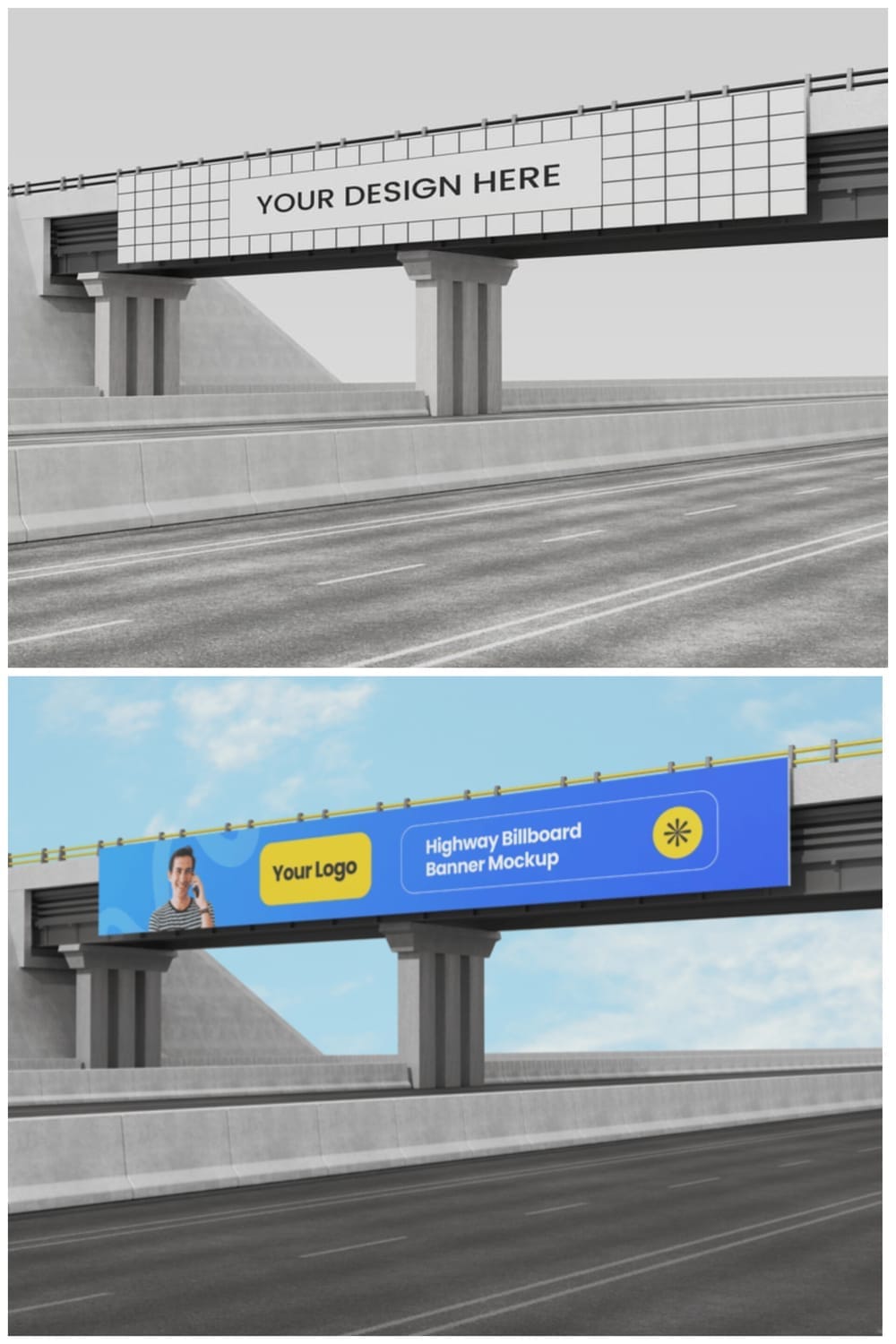 This Highway Overpass Banner Mockup is a single PSD file designed for presenting large-format banners placed over a highway. It features one realistic angle of a horizontal banner mounted on an overpass structure, perfectly capturing the high-traffic environment of highway advertising. The file provides an exceptionally sharp resolution of 4500x3000 pixels at 300 DPI. Customization is simple thanks to the organized layers and folders, the Image/Design Placeholder, and the ability to easily customize the object's color, making it a straightforward and professional tool for any ad campaign.