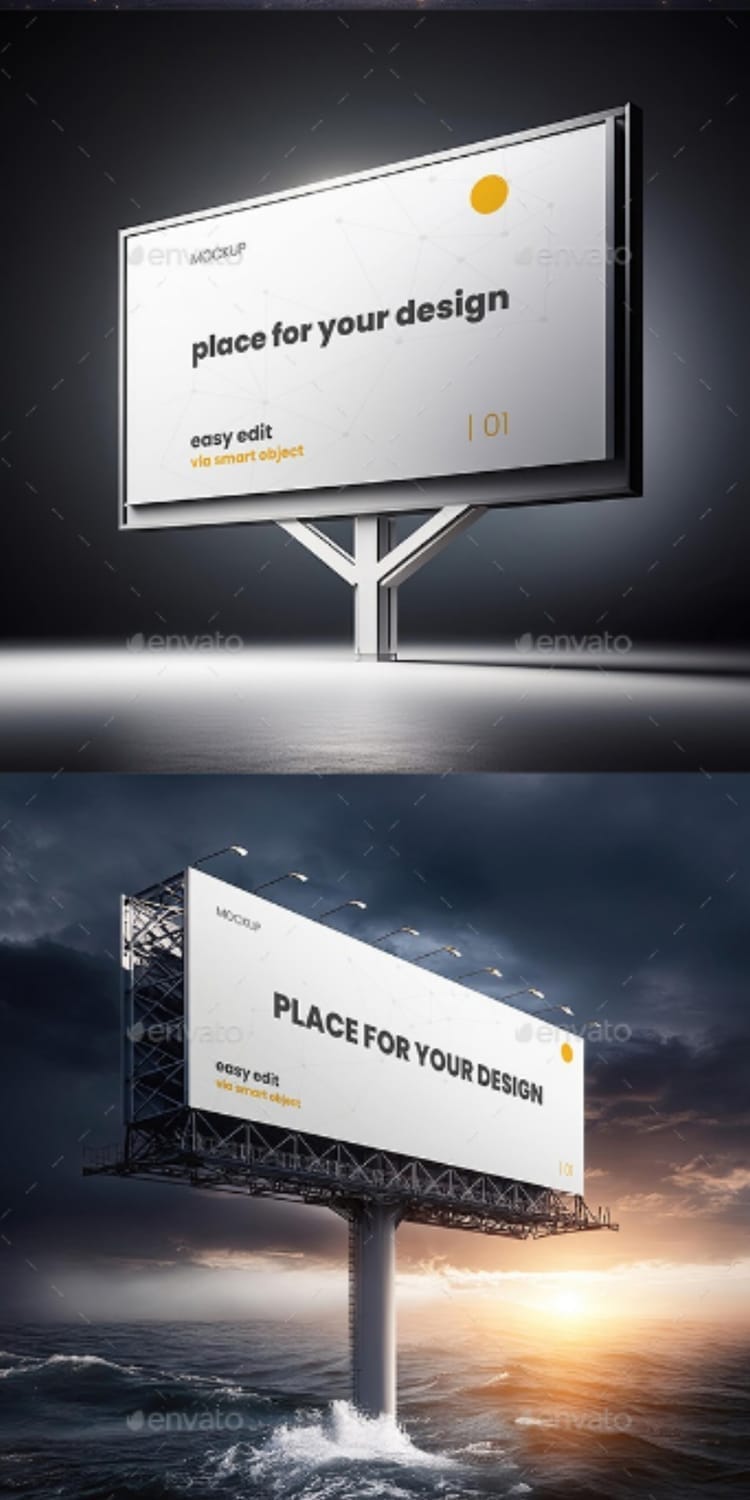 This collection of 12 individual mockup files is a high-concept pack offering diverse styles of billboard and signage presentation, ranging from traditional outdoor placement to sleek, studio-lit settings. The standout feature is a unique, dramatic mockup of a billboard emerging from a stormy sea under an intense sky. All files maintain a high-resolution of 4000 x 4000 px at 300 DPI and are built for very easy design integration via Smart Objects. The variety in this pack, which also includes a unique A-frame sign and illuminated displays, makes it ideal for showcasing a wide range of advertising designs with a modern, dramatic flair.