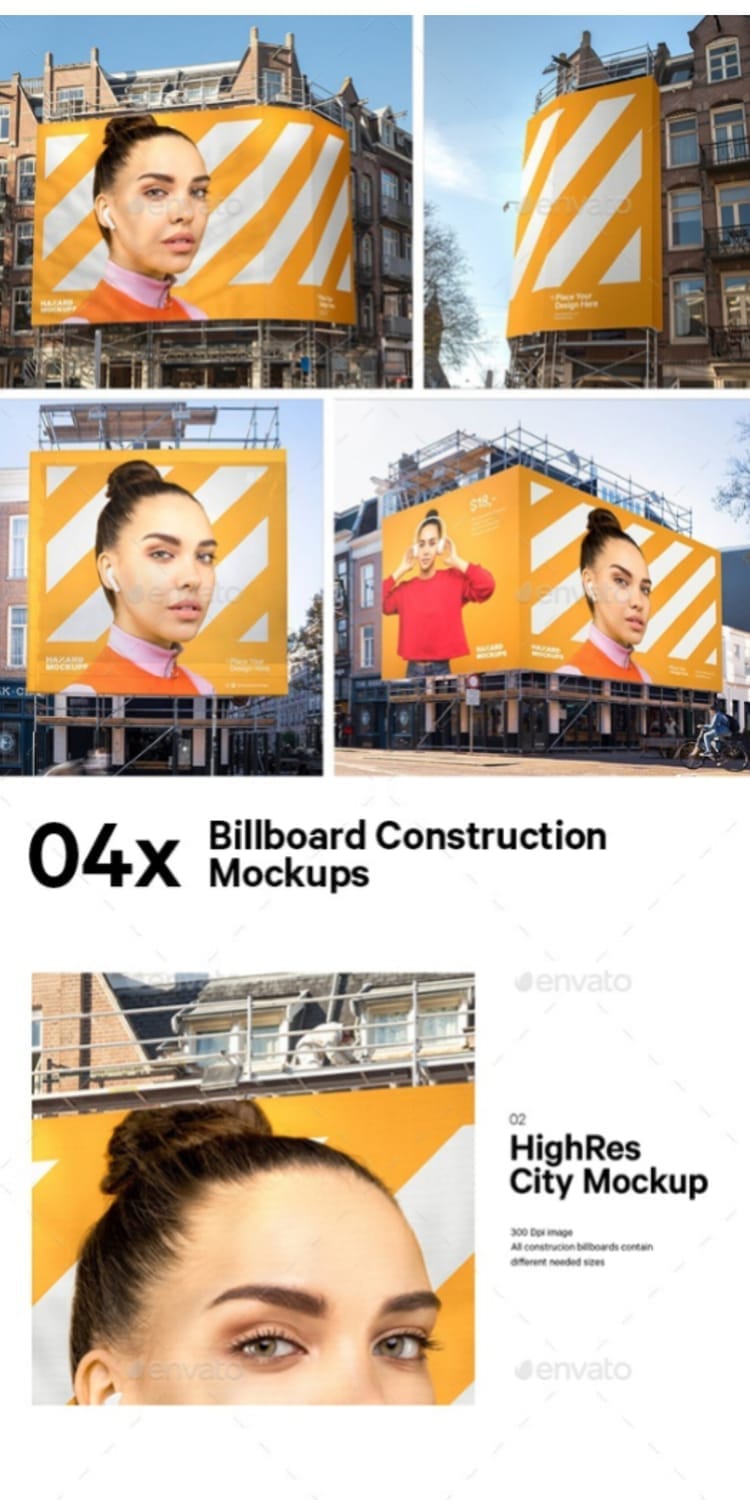 This Billboard Construction Mockup pack offers four high-resolution PSD files that realistically depict large advertisements installed on the scaffolding of urban buildings, often seen during renovation or new development. This unique setting provides a grungy, authentic street-level context for your brand campaign. The mockups cover a mix of horizontal and vertical placements on brick buildings, perfect for presenting urban branding or large-format print advertisements. As standard, all designs are easily placed and edited using Smart Objects.
