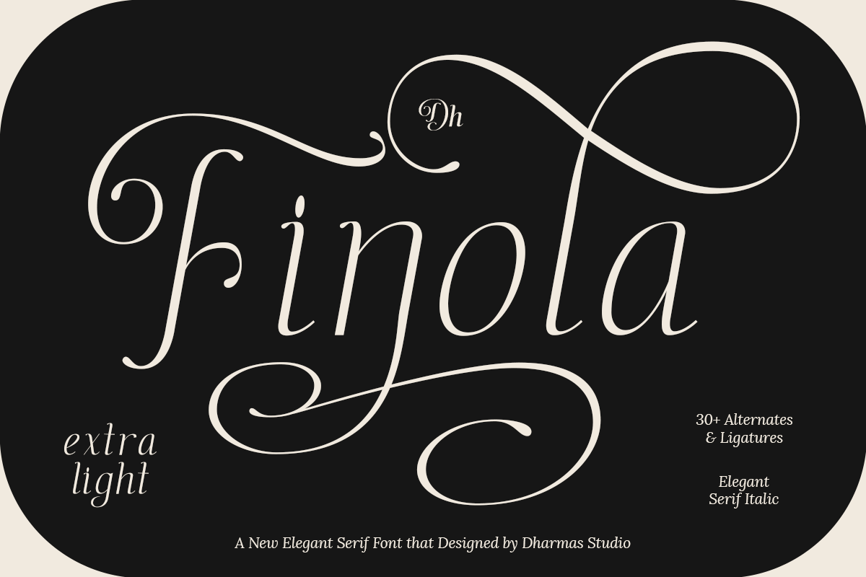 The Finola typeface by Dharmas Studio is a dramatic and highly expressive elegant serif, designed to capture the romance and fluid motion of script writing while maintaining a serif structure. It is presented in an Extra Light Italic weight, giving it a delicate, airy quality.