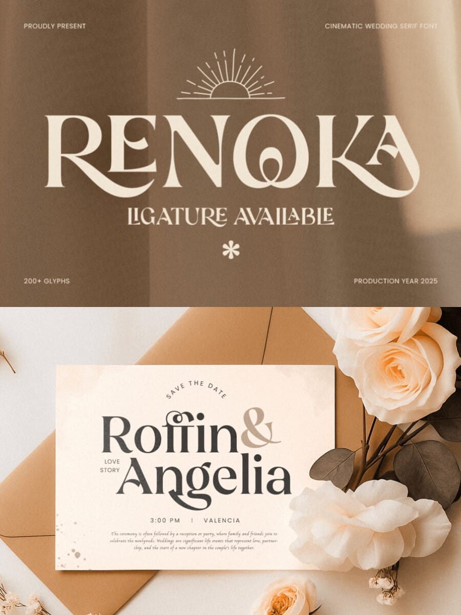 The Renoka typeface is a dramatic and modern display serif designed with a cinematic, narrative feel, making it an excellent choice for a wedding that seeks to tell a grand story.
