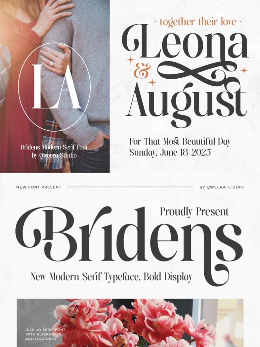 The Bridens typeface by Qweera Studio is a bold display serif that skillfully balances heavy, classic forms with intricate, almost calligraphic ligatures. It is designed to be a centerpiece for contemporary and highly stylized wedding stationery.