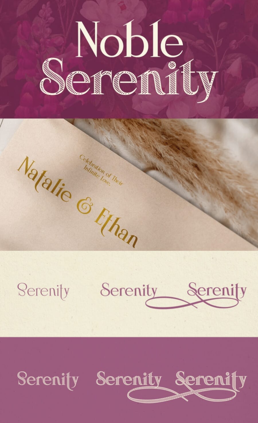 The Noble Serenity typeface is a highly adaptable display serif that offers a spectrum of styles from bold formality to delicate swash-laden romance, making it incredibly versatile for sophisticated wedding stationery.