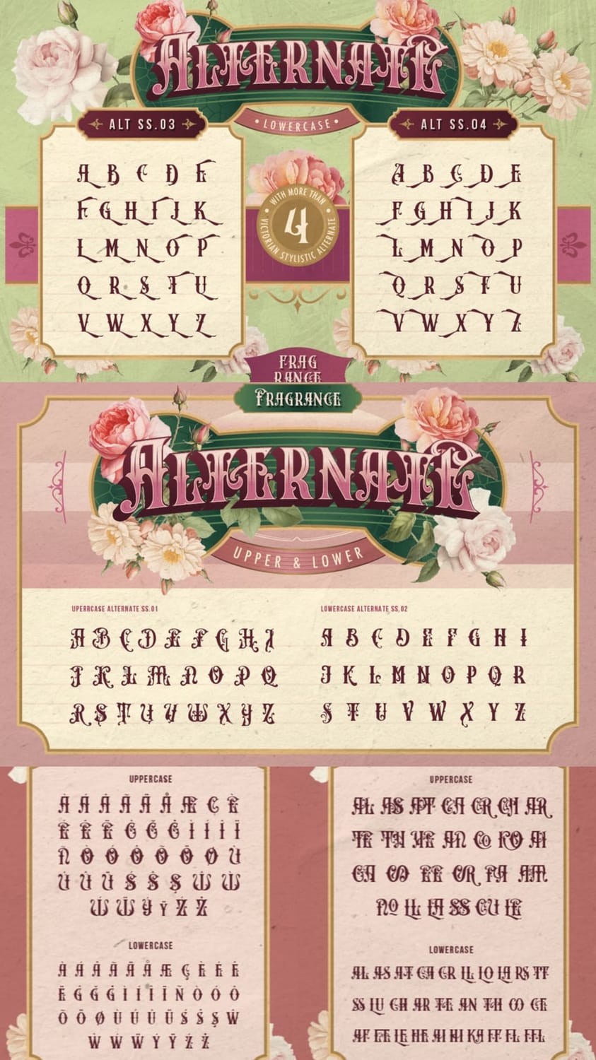 Use the decorative alternates sparingly for initials or key words, then switch to the regular style for the rest of the text. This keeps the design authentic and expressive without overwhelming modern layouts.
