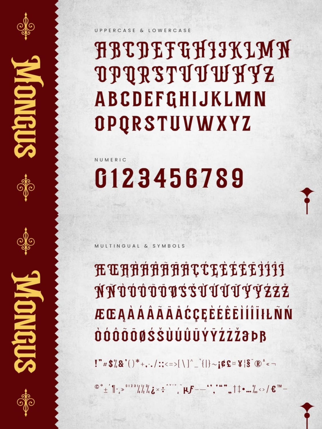 Mongus is a bold Victorian display serif with engraved and slightly gothic influences. Its sharp serifs, compact proportions, and confident vertical strokes give it a noble, authoritative, and luxurious personality.