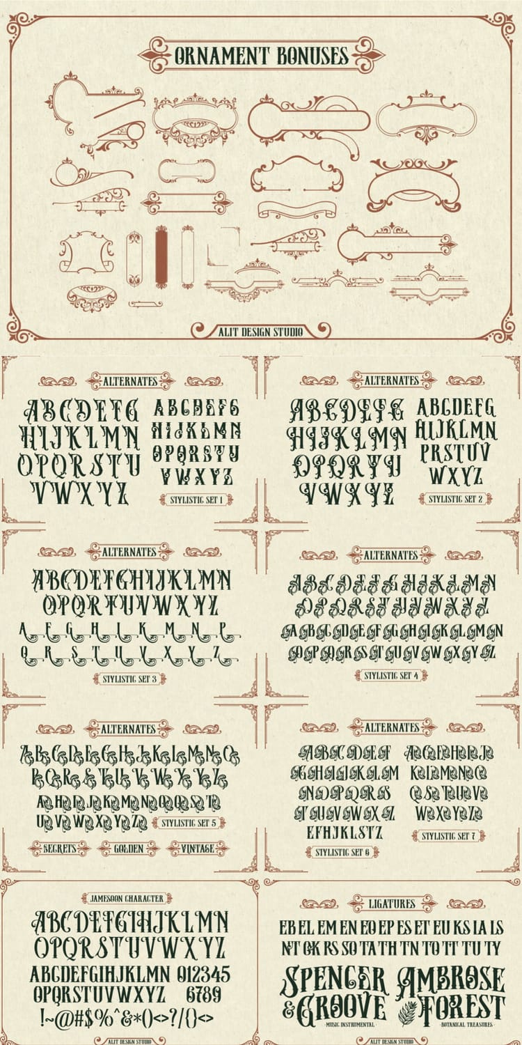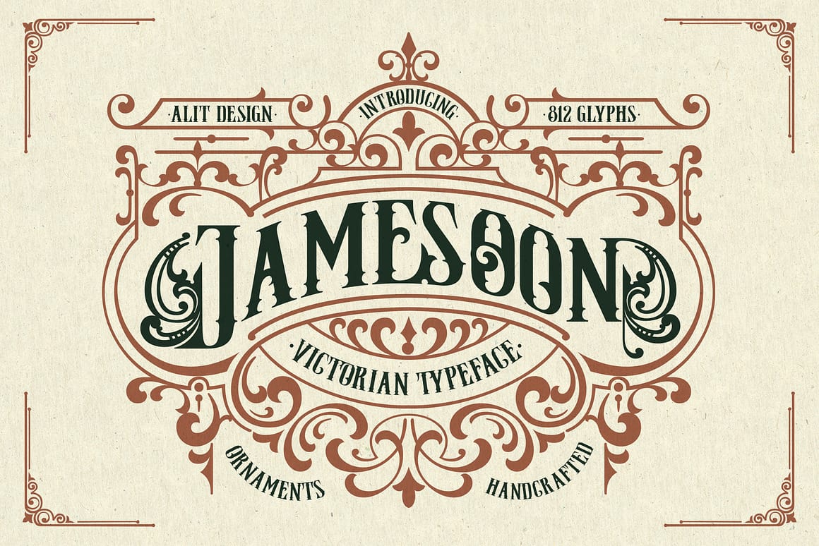 Jameson captures the essence of Victorian typography through its elaborate frame ornaments, high-contrast strokes, and engraved letterforms reminiscent of 19th-century posters and product labels. The ornamental symmetry and handcrafted details reflect the era’s obsession with craftsmanship and visual richness.
