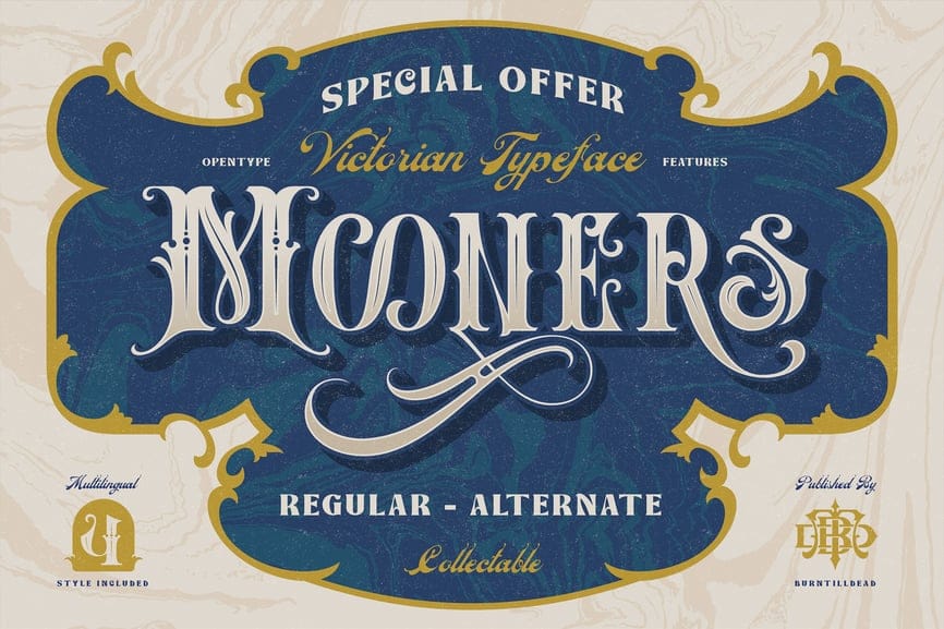 Mooners captures Victorian-era typography through its high-contrast strokes, ornamental curves, and classic serif structures. The availability of decorative and plain alternates mirrors 19th-century type found in advertisements, playbills, and product labels, where elegance and embellishment were key.