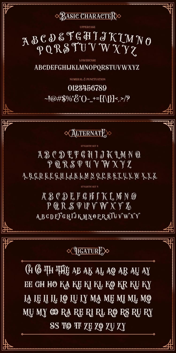 Herobeam draws heavily from 19th-century engraved typography, featuring high-contrast strokes, ornamental letterforms, and elaborate ligatures typical of Victorian posters and signage. The symmetrical framing elements and decorative alternates echo the era’s love for grandeur, craftsmanship, and storytelling through type.