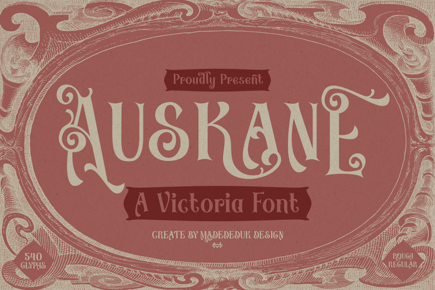 Auskane captures the spirit of Victorian typography through its ornate swirls, delicate curves, and decorative ligatures. These flourished details mirror the elaborate lettering styles commonly used in 19th-century advertisements, invitations, and ornamental print designs where craftsmanship and elegance were central.